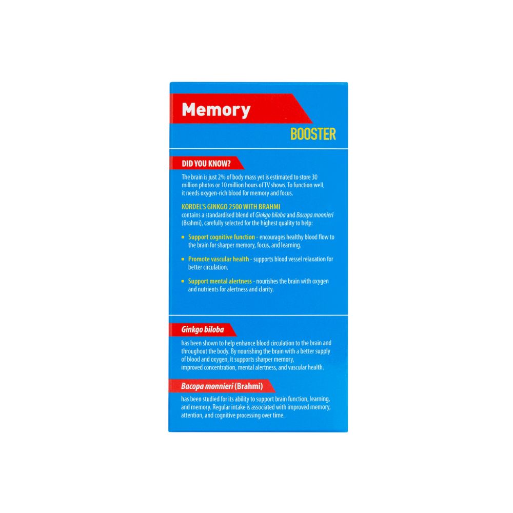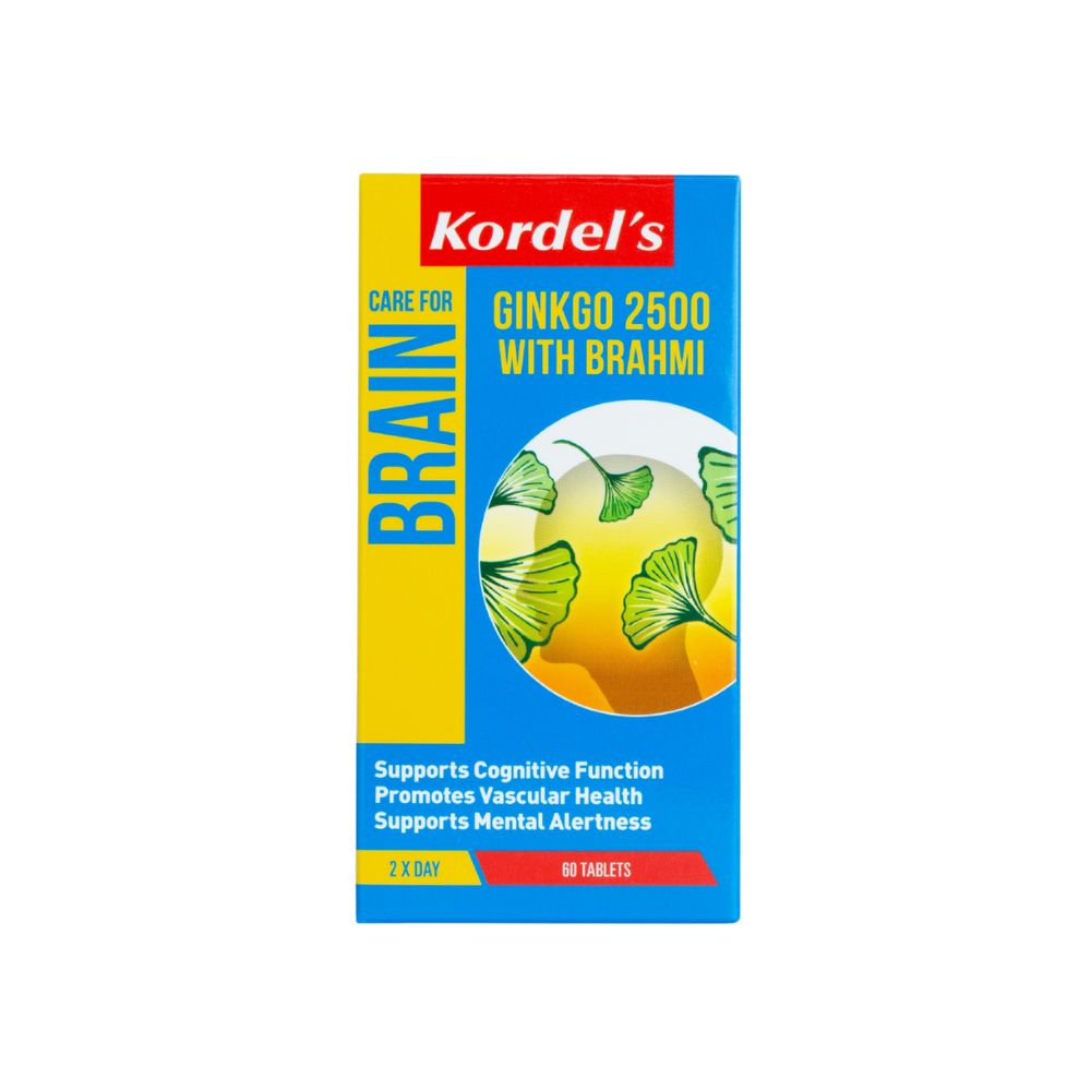 Kordel’s Ginkgo 2500 with Brahmi contains standardised amounts of Ginkgo Biloba and Bacopa Monnieri. This formula supports memory, concentration and calmness during stressful periods.