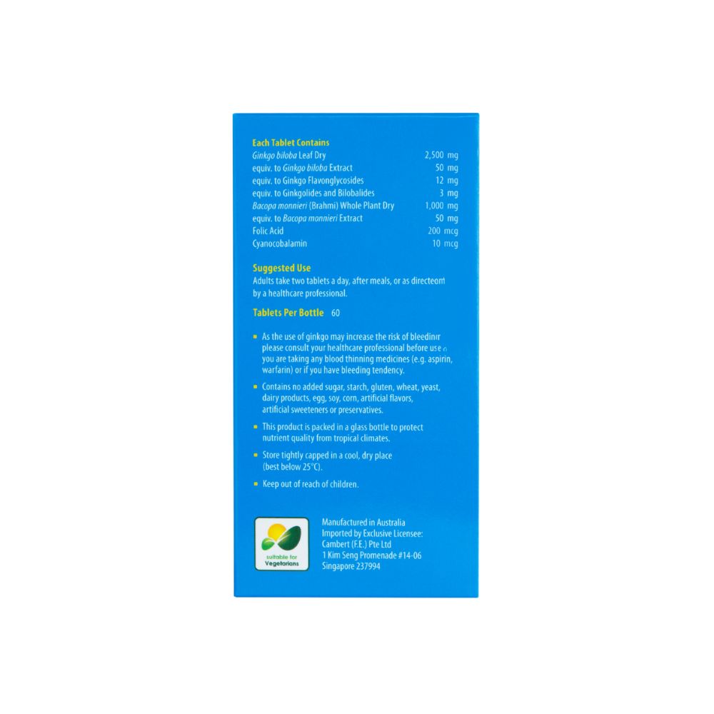 Ginkgo Biloba (Ginkgo) and Bacopa Monnieri (Brahmi) respectively support blood circulation to the heart and cognitive functions of the brain. These actions are important for mental alertness, memory and vascular health.